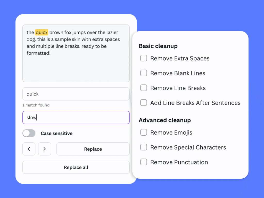 Text Cleaner makes tidying up your words effortless. In just a few steps, you can remove extra spaces, fix line breaks, strip unwanted symbols, and format your text exactly how you want, all without leaving your design.